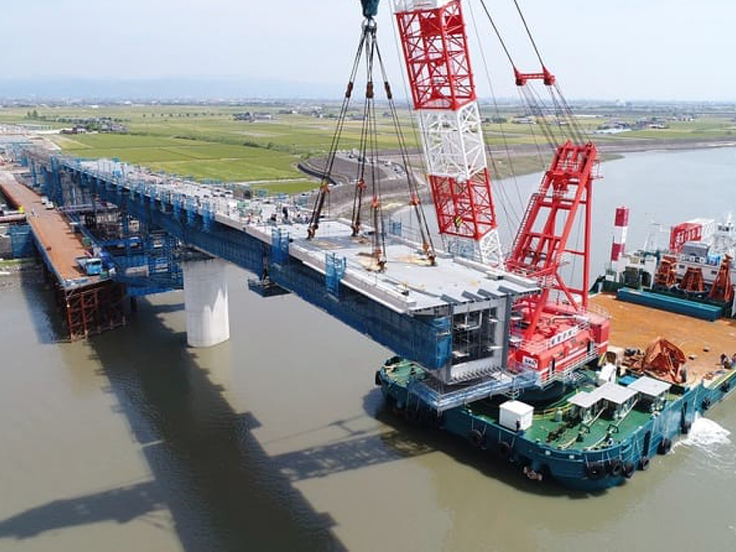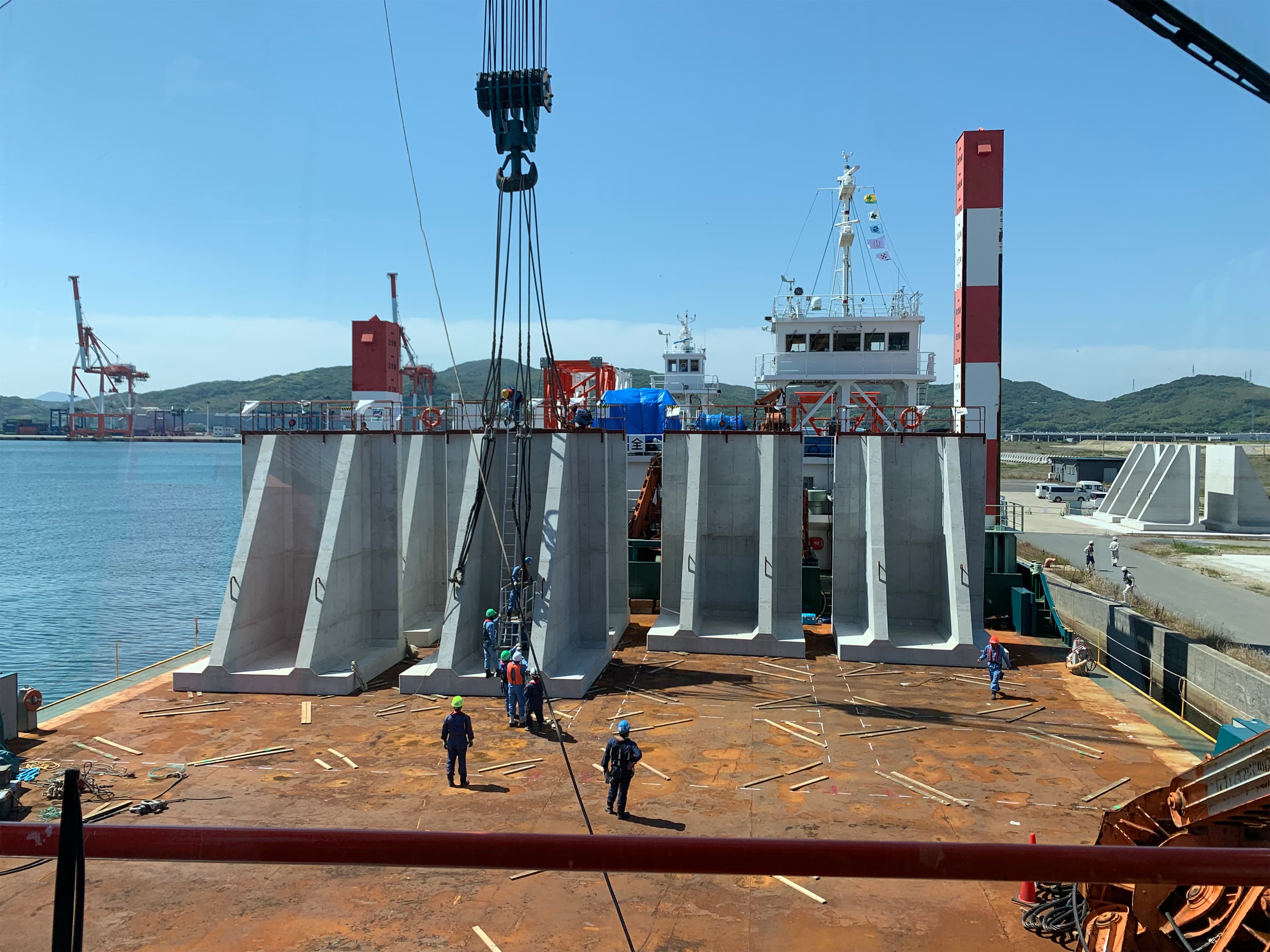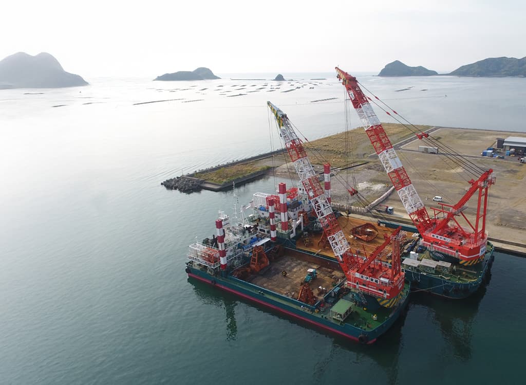 船舶部では、主に起重機船を活用した港湾工事を中心に事業を展開しています。当社は、350トン吊りおよび600トン吊りの全旋回式多目的作業船を保有しており、これを駆使して地域レベルから国家規模に至るまで、幅広いプロジェクトに対応しています。これまでの事業実績は、多くの分野で高く評価されており、その信頼は年々強固なものとなっています。さらに、これらの成果は単なる過去の実績にとどまらず、未来に向けて海を開拓し、新たな可能性を切り拓くための大きな一歩となるものです。